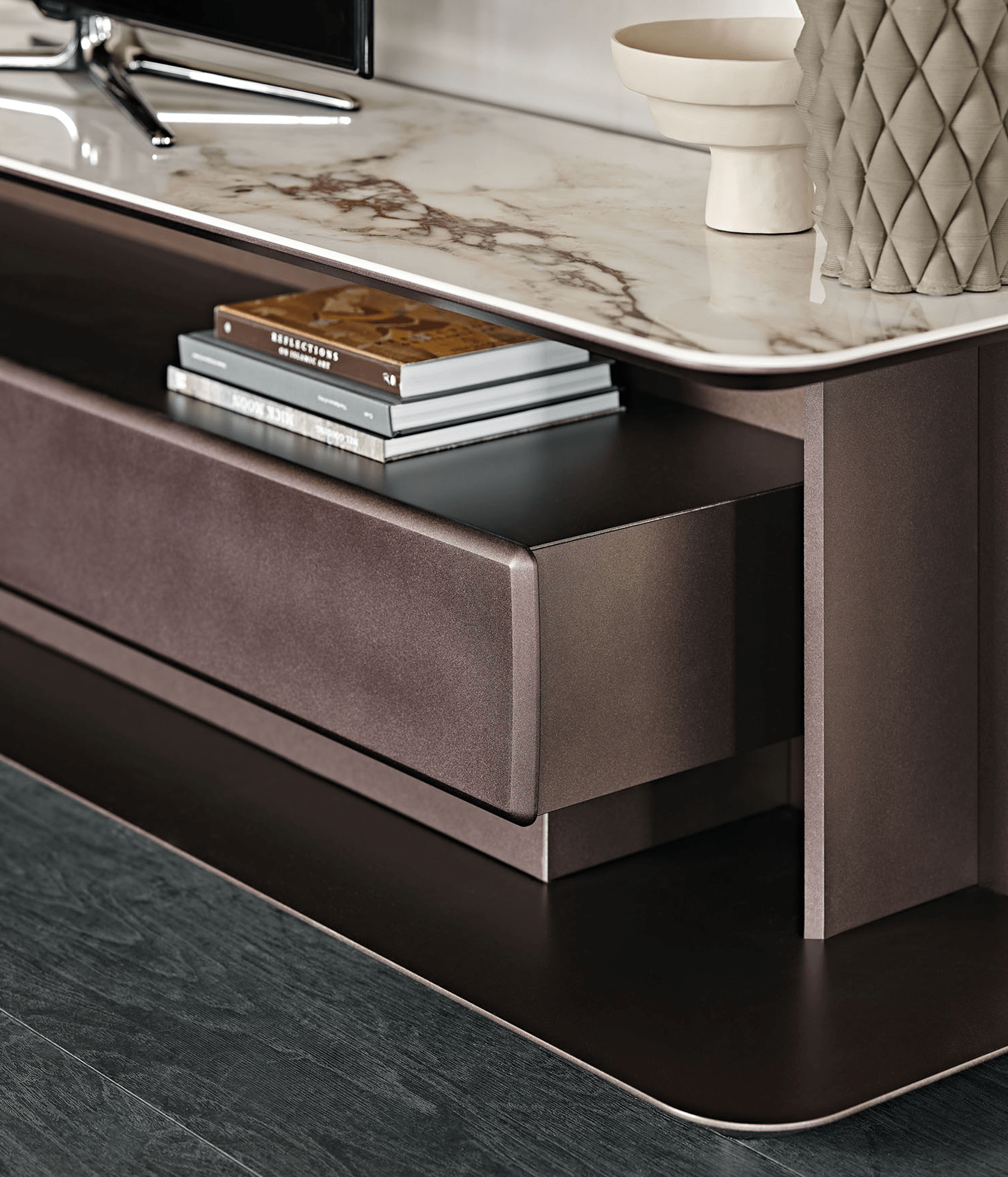 - Lacquered Titanium Embossed Wood Cabinet