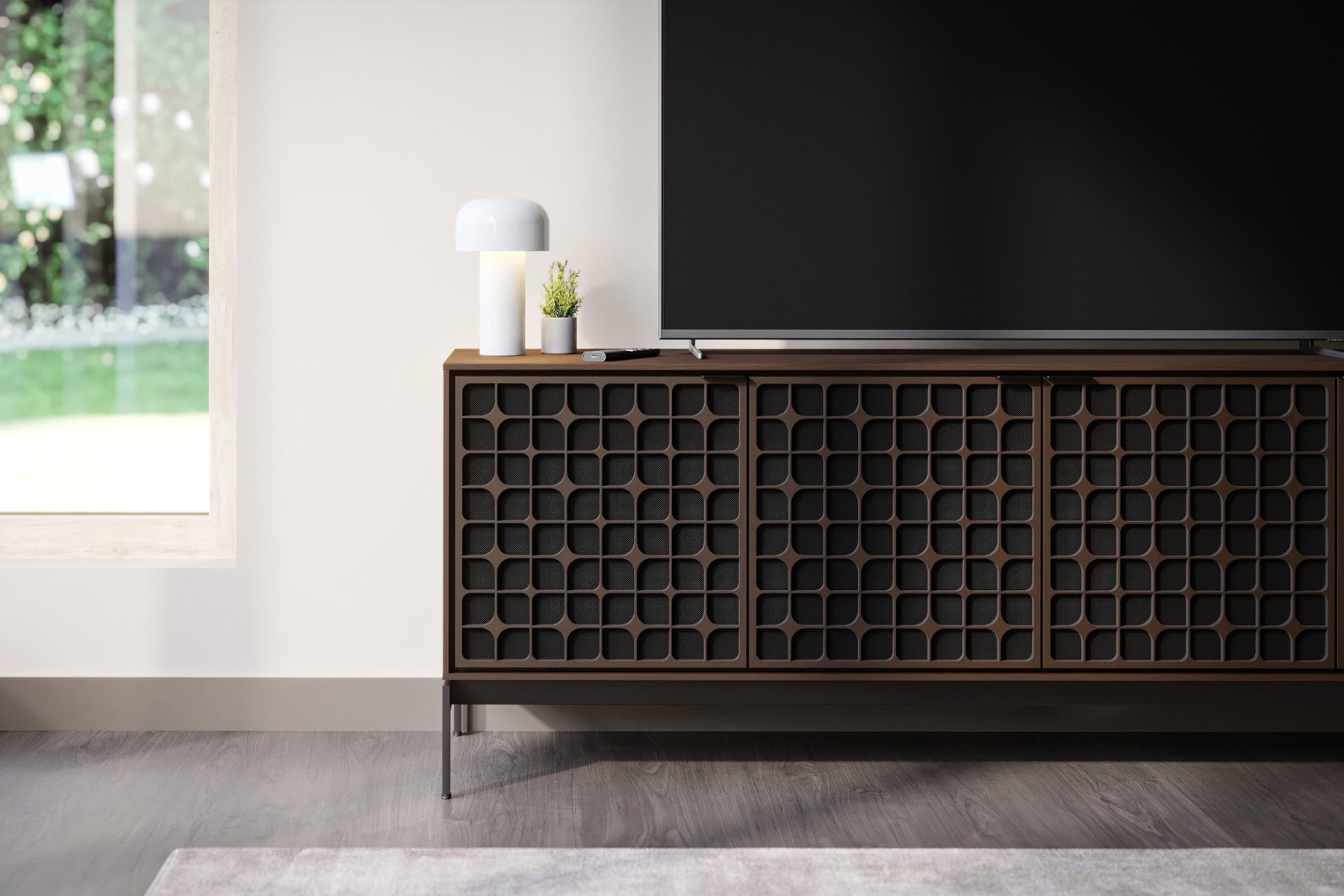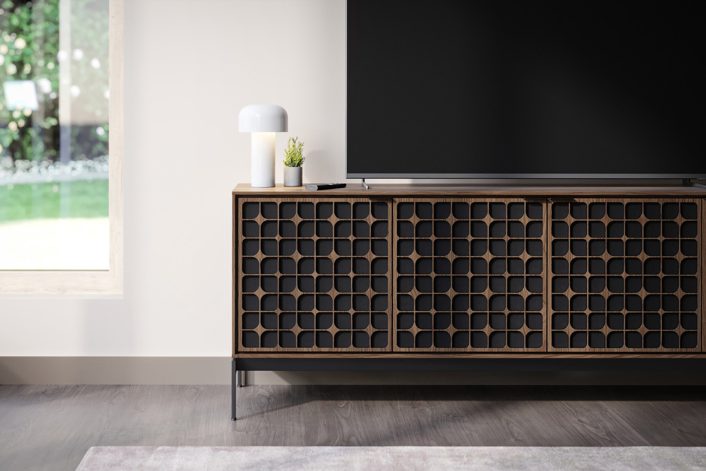 - Double-Width Center Compartment Opens to Reveal a Large Storage Shelf Suitable for Use with Most Soundbar Speakers