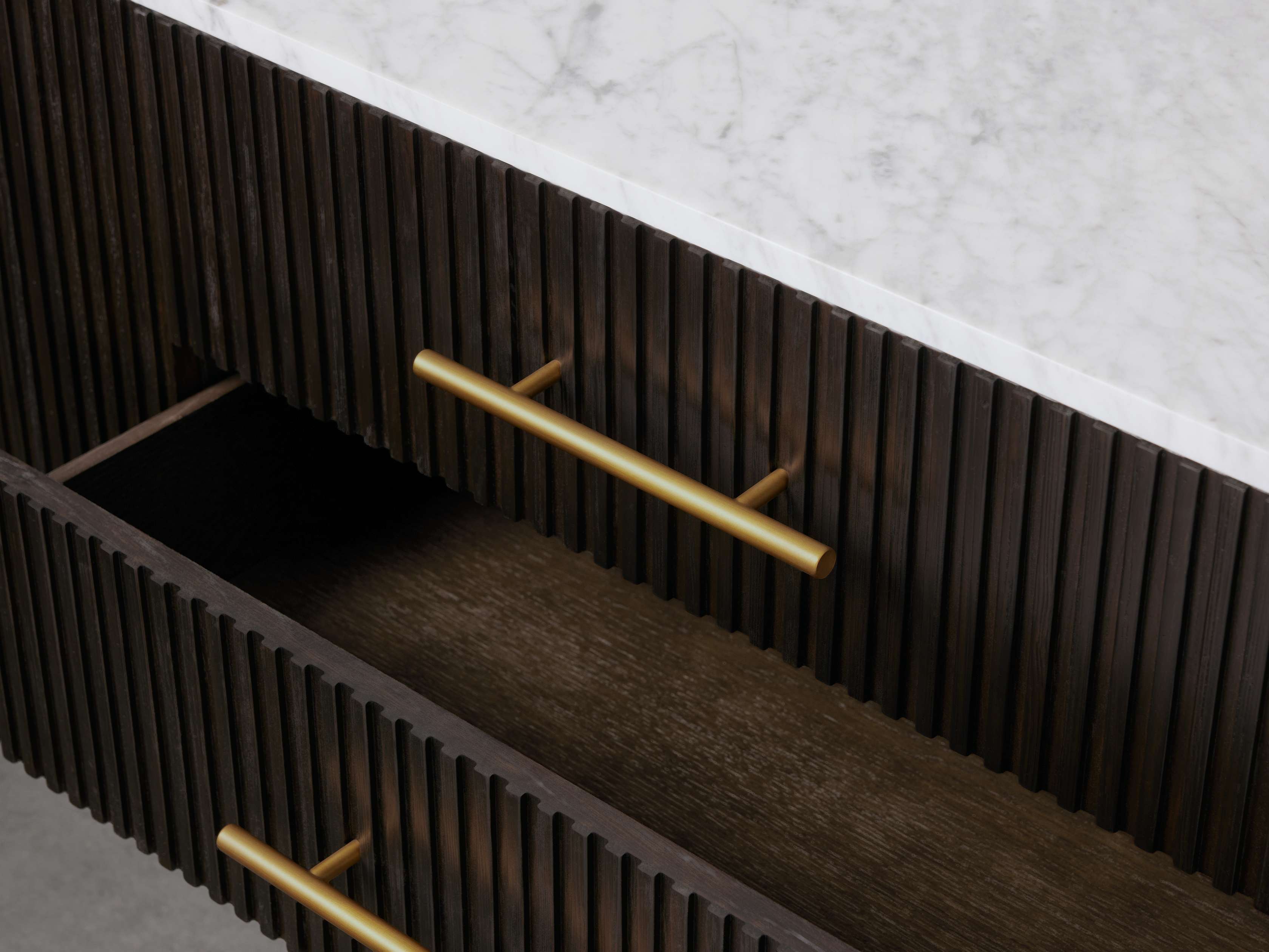 Our Finnley Collection showcases a stunning mixed-material design, inviting elevated style into your dining space. Hand-finished pine from Finland or white oak wood is luxuriously complemented by a stone top, accented by brass hardware and reeded oak detailing. The result is an eclectic-yet-chic collection perfect for gatherings that linger long into the night.