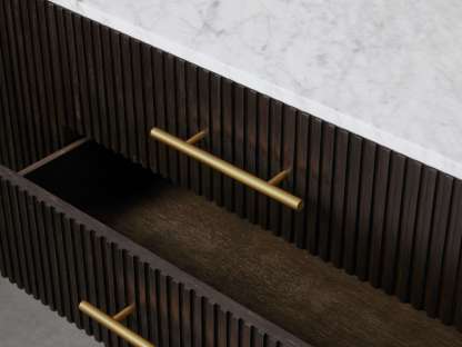 • Craftsman-built pieces feature reinforced mortise-and-tenon joinery for added strength and stability and are complemented by white marble or bluestone tops.