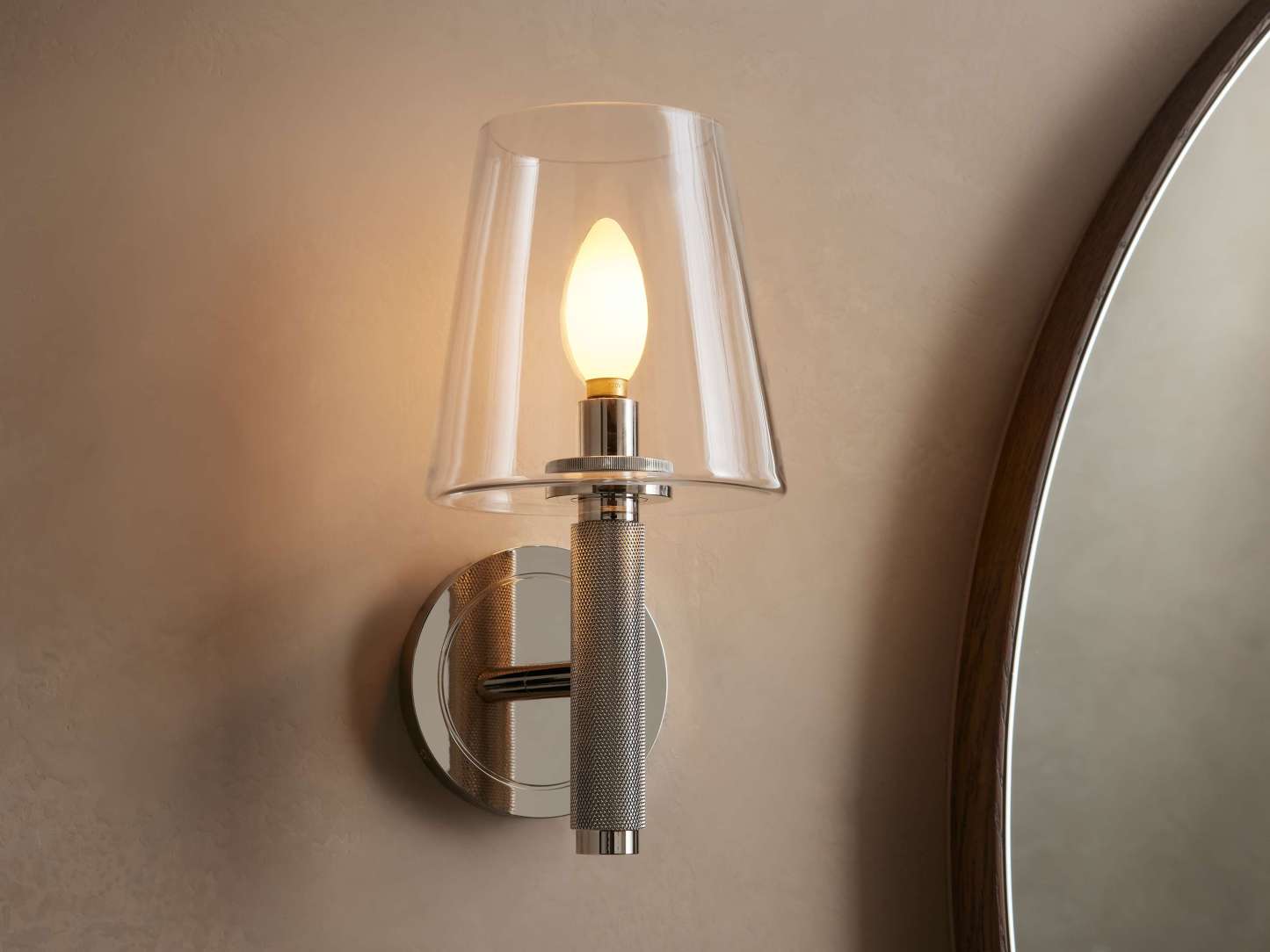Minimalist silhouettes that pair beautifully with any bathroom aesthetic―our Monroe Lighting Collection features knurled detailing on two finishes and your choice of clear or milk glass to customize your space.
