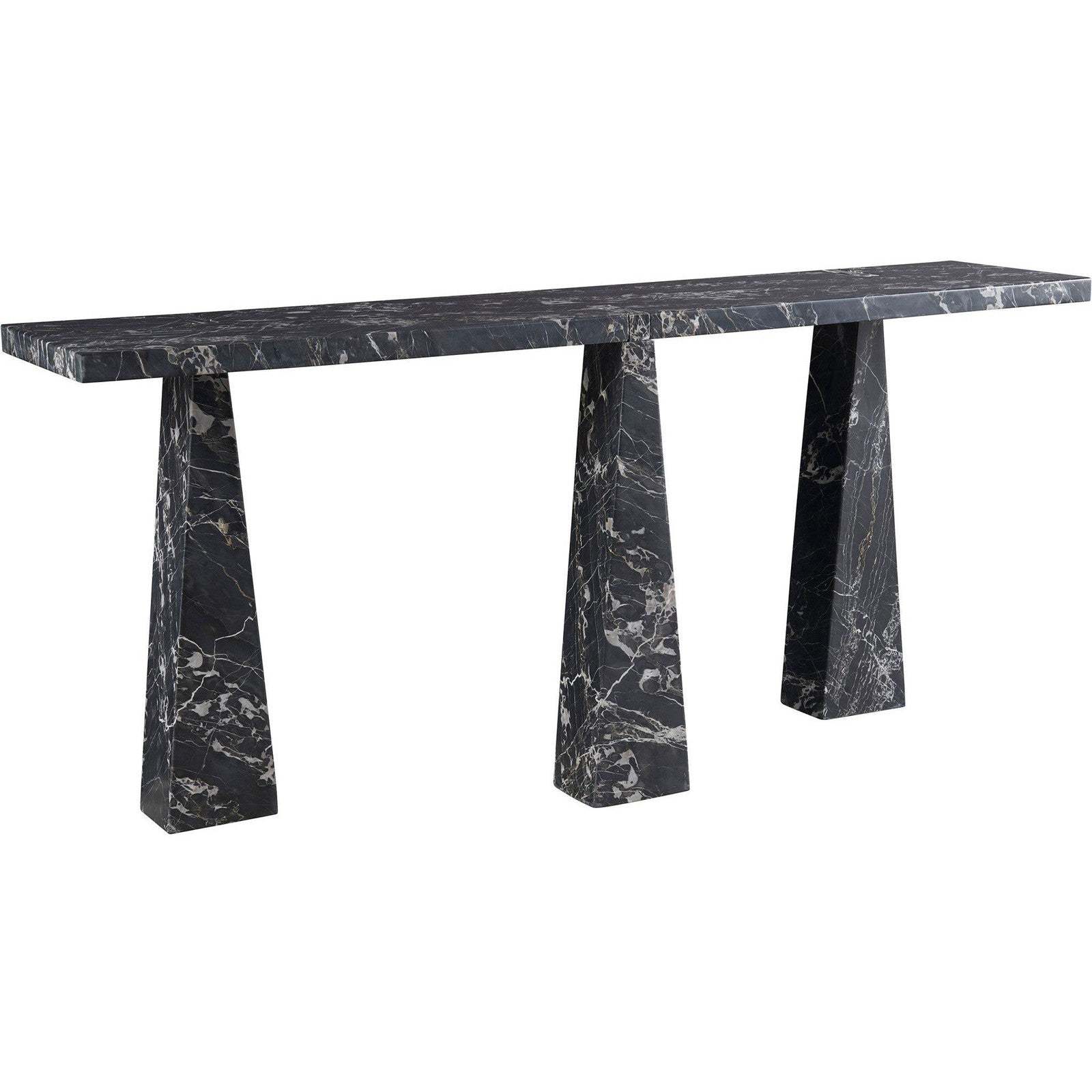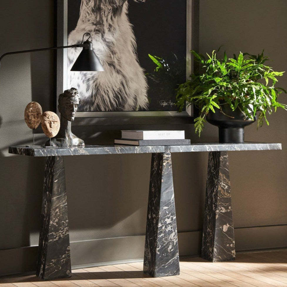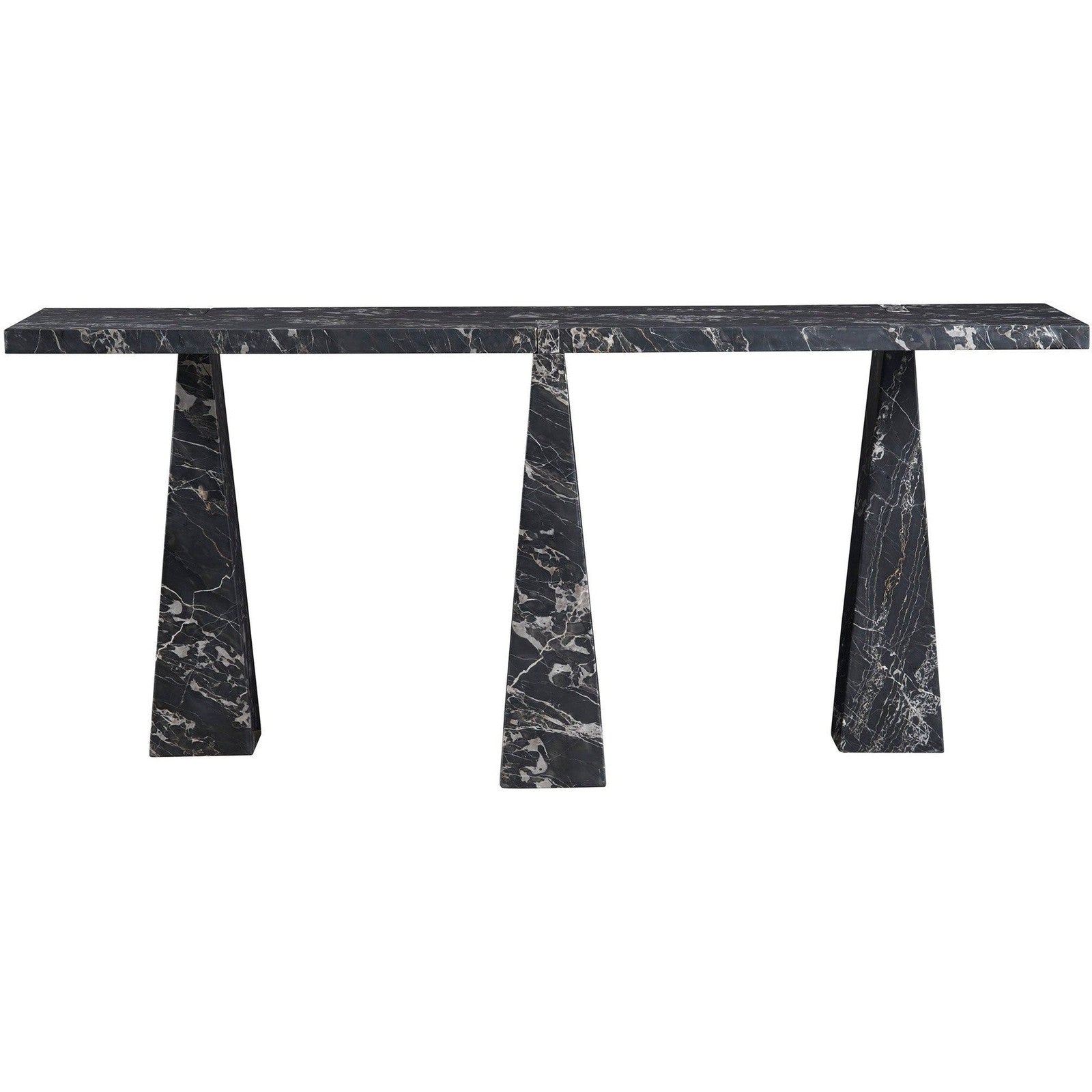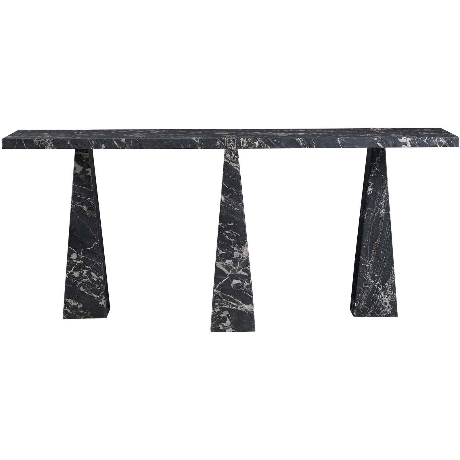 • The Spectrum Sofa Table is a masterpiece of drama and depth, sculpted entirely from Golden Portoro marble, characterized by its rich, moody tones and striking white veining.